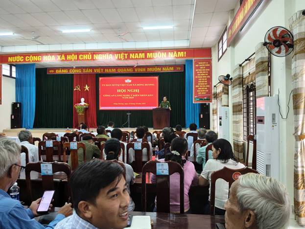 Tại hội nghị, Trung tá Lê Hữu Tuấn – ĐUV, Phó Trưởng Công an xã Đồng Dương đã thông tin đến người dân về tình hình an ninh trật tự, công tác xây dựng lực lượng Công an xã, xây dựng nếp sống văn hóa vì nhân dân phục vụ, việc "Học tập và làm theo tư tưởng, đạo đức, phong cách Hồ Chí Minh - Công an nhân dân vì nước quên thân, vì dân phục vụ". Phương hướng thời gian tới Công an xã tiếp tục thực hiện tốt công tác bảo đảm tình hình an ninh chính trị, trật tự an toàn xã hội trên địa bàn xã Đồng Dương. Chủ động nắm tình hình, phát hiện và xử lý các vụ việc, hiện tượng xảy ra trên địa bàn, không để hình thành điểm nóng làm ảnh hưởng đến tình hình an ninh chính trị, trật tự an toàn xã hội trên địa bàn xã. Tiếp tục thực hiện tốt nhiệm vụ chuyên môn và công tác tham mưu cho Công an thành phố, cấp ủy, chính quyền địa phương trong công tác đảm bảo tình hình an ninh chính trị, trật tự an toàn xã hội.