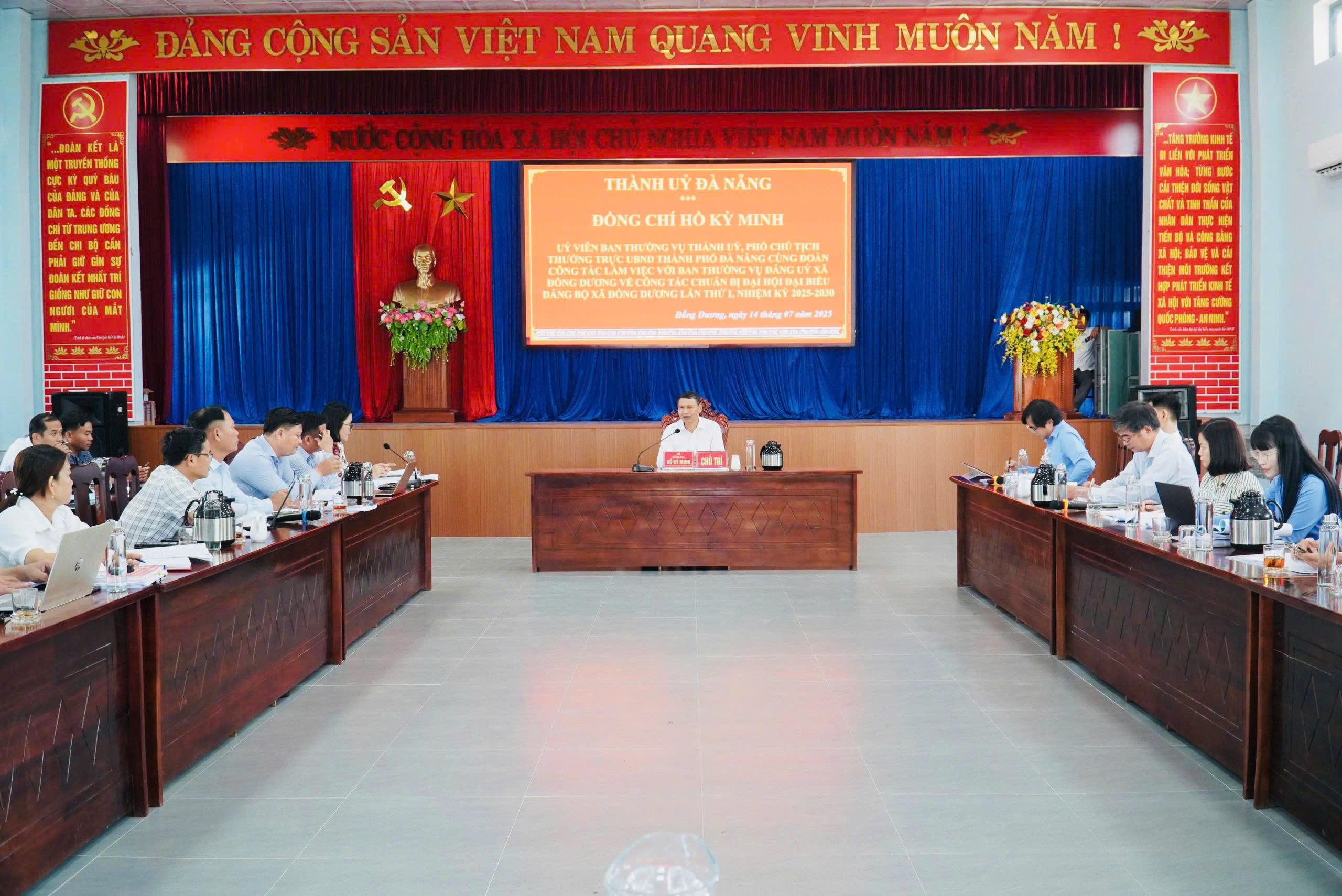 Phát biểu chỉ đạo tại buổi làm việc, Phó Chủ tịch Thường trực UBND thành phố Hồ Kỳ Minh đánh giá cao sự chủ động của Đảng ủy xã Đồng Dương trong công tác chuẩn bị Đại hội đại biểu Đảng bộ xã lần thứ I, nhiệm kỳ 2025 – 2030. Đồng thời đề nghị xã Đồng Dương tiếp tục rà soát từng nội dung trong văn kiện, kịch bản, chương trình, nội dung báo cáo chính trị, chương trình hành động, nghị quyết nhiệm kỳ mới…