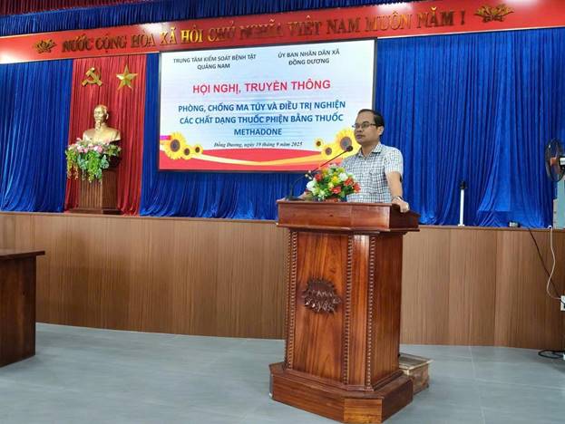 Chiều 19/9/2025, tại Hội trường Đảng uỷ xã Đồng Dương Uỷ ban nhân dân xã Đồng Dương phối hợp với Trung tâm Kiểm soát bệnh tật Quảng Nam tổ chức hội nghị truyền thông Phòng, chống ma tuý và điều trị nghiệm các chất dạng thuốc phiện bằng thuốc Methadone. Tham dự hội nghị có Đồng chí Đỗ Trường Lưu – phó trưởng khoa phòng chống HIVS trung tâm kiểm soát bệnh tật Quảng Nam – Báo cáo viên. Đồng Chí Lưu Đức Phương – UVBTV Đảng ủy – Phó chủ tịch UBND xã Đồng Dương, Bác sỹ Nguyễn Kim Trọng – Phó trưởng Khoa kiểm soát bệnh tật Trung tâm y tế khu vực Thăng Bình, cùng các đại biểu đại diện cho các ban ngành, đại diện các trạm y tế trên địa bàn, các đồng chí trưởng thôn, trưởng ban công tác mặt trận thôn, các chi đoàn, nhân viên y tế thôn, người nghiệm ma tuý và đại diện gia đình có người nghiện ma tuý tham dự chương trình hội nghị