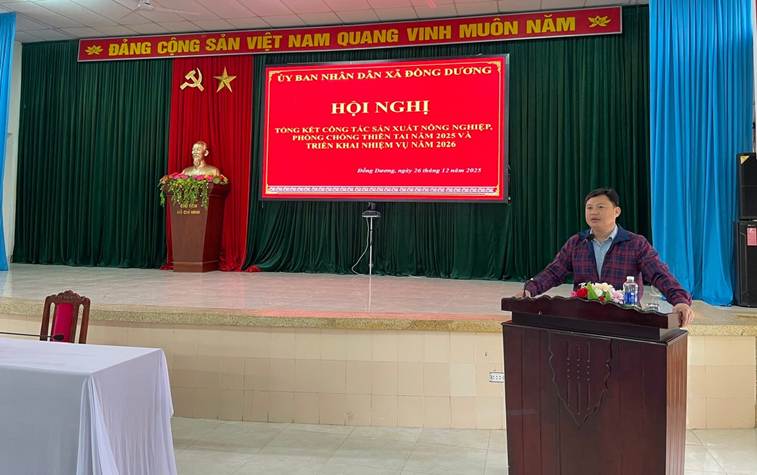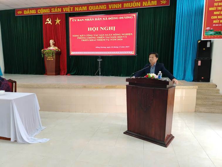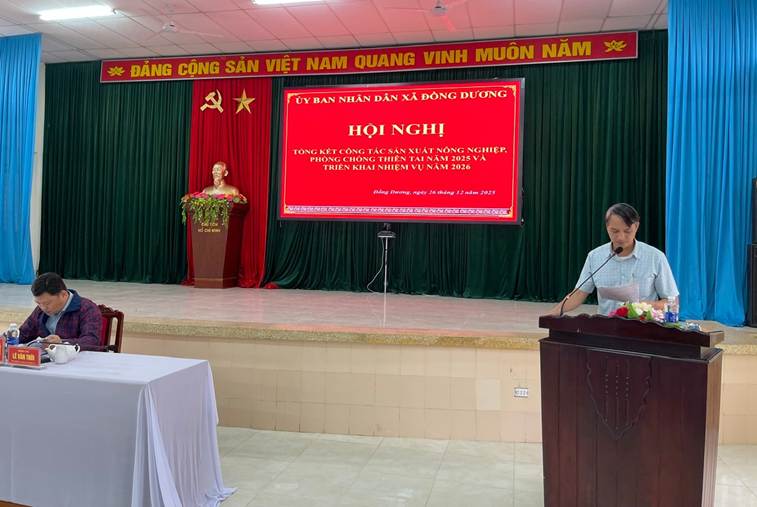 Hội nghị do đồng chí Lê Văn Thôi – Phó Bí thư Đảng ủy, Chủ tịch UBND xã Đồng Dương chủ trì. Tại hội nghị, các đại biểu đã nghe Báo cáo tổng kết công tác sản xuất nông nghiệp và phòng chống thiên tai năm 2025. Báo cáo nêu rõ: mặc dù gặp nhiều khó khăn do thời tiết diễn biến phức tạp, dịch bệnh trên cây trồng, vật nuôi, đặc biệt là dịch tả lợn Châu Phi tái phát trên diện rộng, song với sự chỉ đạo quyết liệt của chính quyền và sự đồng thuận của Nhân dân, lĩnh vực trồng trọt vẫn cơ bản đạt và vượt kế hoạch đề ra; công tác phòng, chống thiên tai được triển khai kịp thời, hiệu quả, hạn chế thấp nhất thiệt hại về người và tài sản.