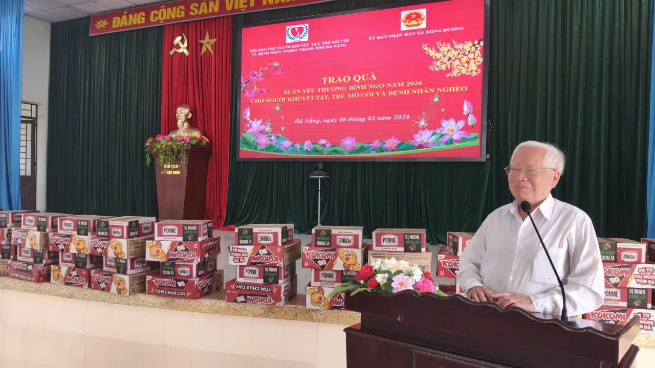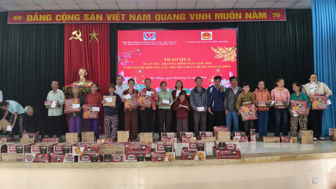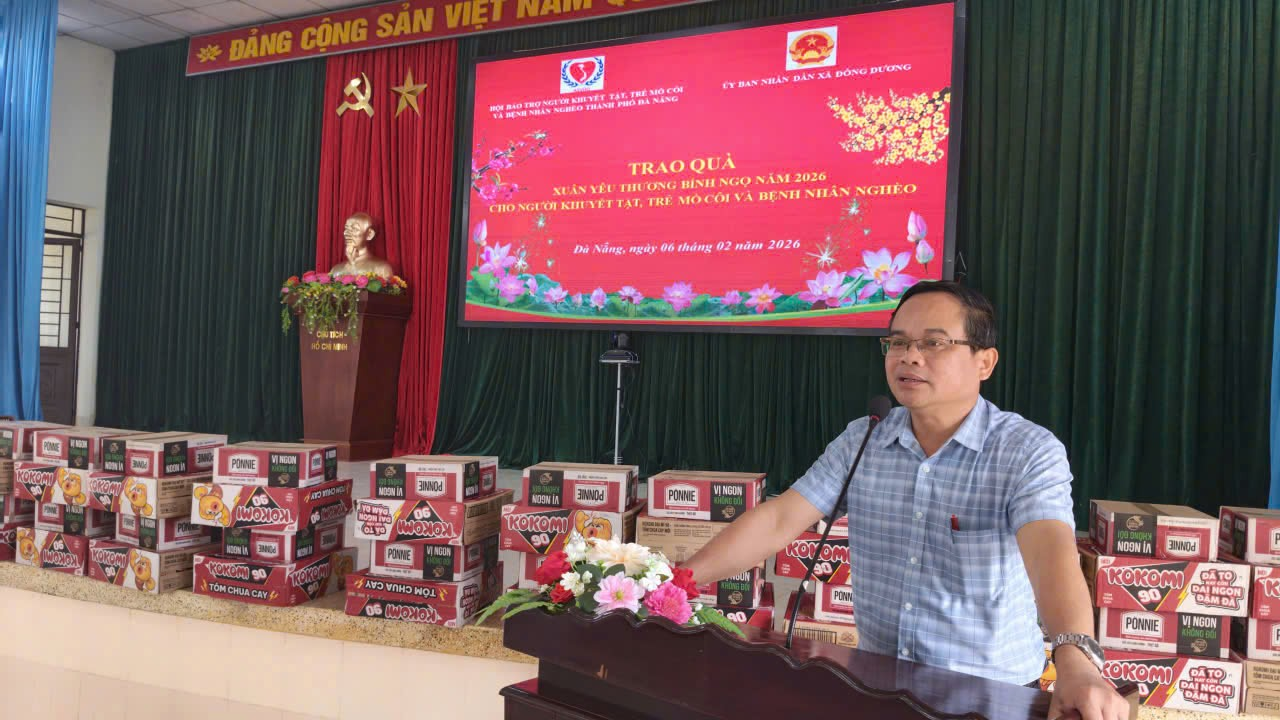 Sáng ngày 06/02/2026, Ủy ban nhân dân xã Đồng Dương phối hợp với Hội bảo trợ Người khuyết tật, trẻ em mồ côi và bệnh nhân nghèo thành phố Đà Nẵng long trọng tổ chức buổi trao tặng quà cho các đối tượng khuyết tật, trẻ em mồ côi và bệnh nhân nghèo có hoàn cảnh đặc biệt khó khăn trên địa bàn xã Đồng Dương.